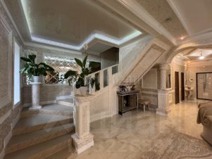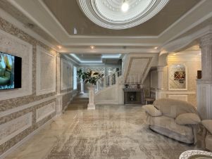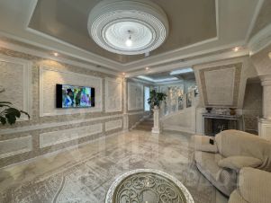-Стены обои, декоративная штукатурка и лепнина из гипса.