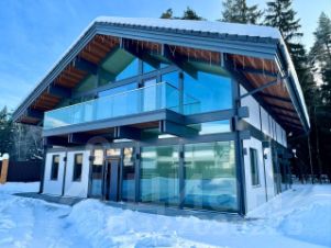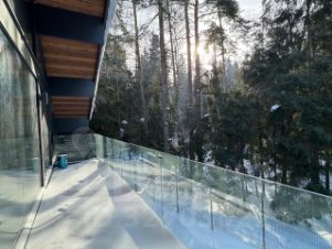 Этот дом воплощение гармонии леса и света , проникающего сквозь огромные стеклянные фасады. Общая площадь коттеджа составляет 364 м² расположенных на участке с тщательно продуманным ландшафтом: сосны, газон, стройные туи и собственный выход в сосновый лес.