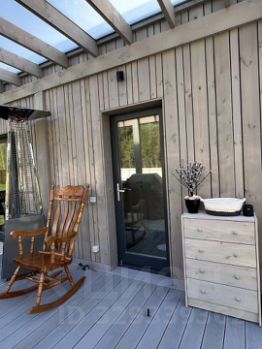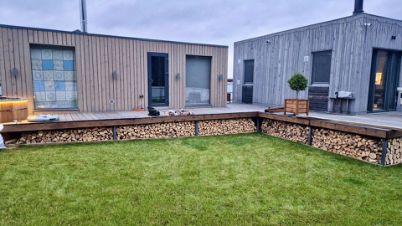 Дом и баня объединены общей террасой единое пространство для отдыха.
