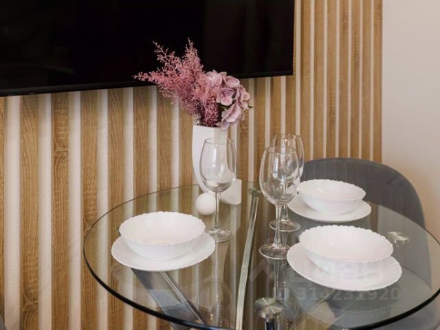 В гостиной: диван-кровать 140х200, кресло-кровать, платяной шкаф, комод, туалетный столик с зеркалом, телевизор 43' (300+ каналов, KION), гладильная доска, утюг, кондиционер.