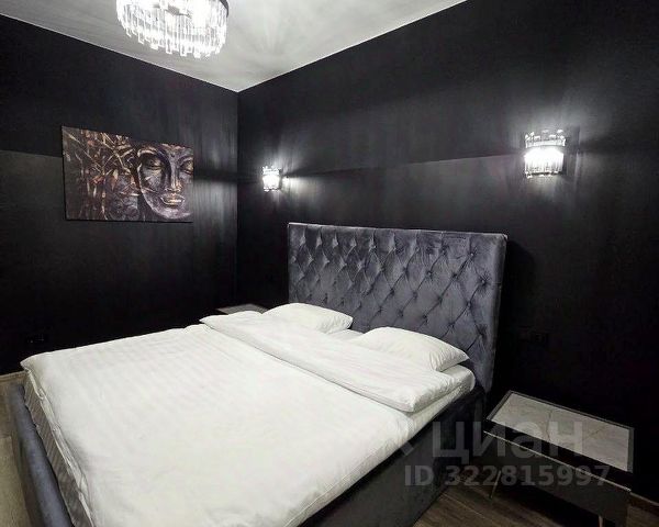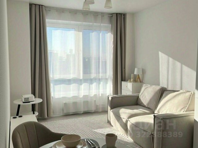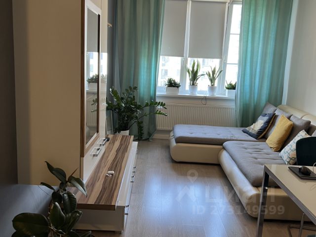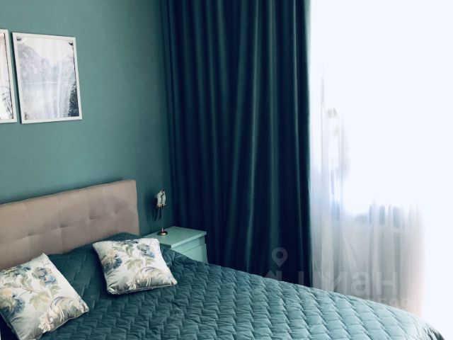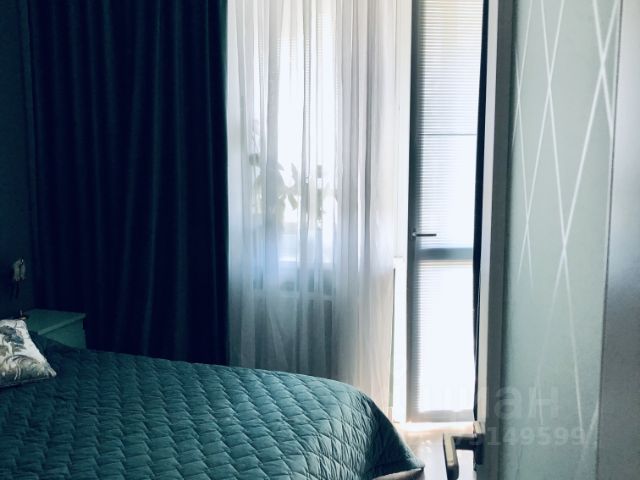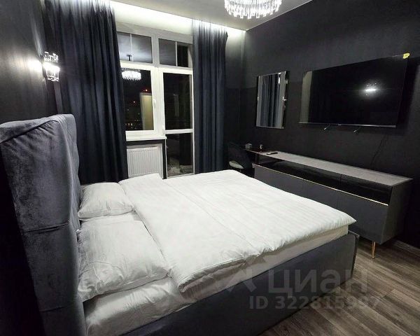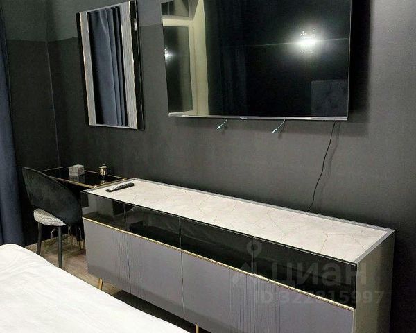 Одна из комнат полностью обставлена мебелью для использования в качестве спальни: 2-спальная кровать 160х200, матрас и полный комплект спальных принадлежностей, 2 прикроватные тумбы, туалетный столик, шкаф-купе, а также 43" телевизор и тумба под ним. Потолочный светильник с настраиваемой световой температурой и два бра над постелью. К спальне примыкает лоджия, на которой есть комод. Вид - во двор соседнего дома и на лесопарковую зону.