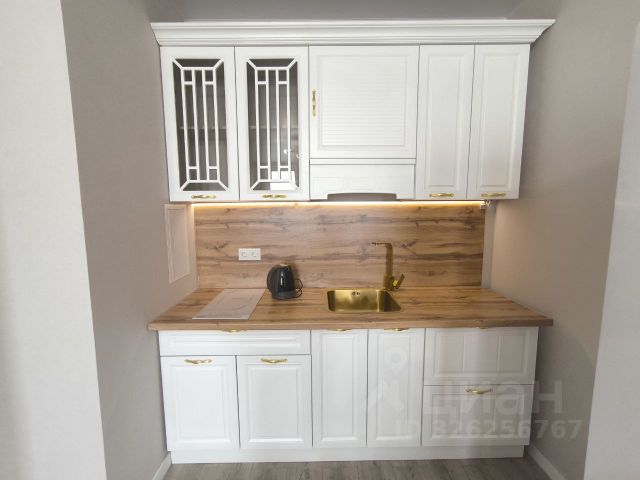 - вместительный кухонный гарнитур с приятными для глаза и на ощупь фасадами (белого цвета и под дерево) и с множеством шкафов, которые позволят без проблем разместить всю кухонную утварь,
