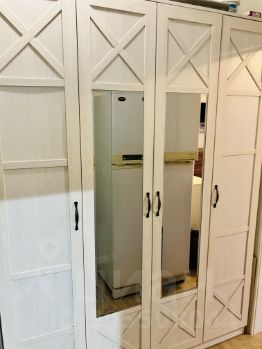 Есть большая и очень вместительная гардеробная с вешалками, шкафами и всем необходимым для размещения большого количества вещей (на фотографиях вещи есть, но уже все вывезены).