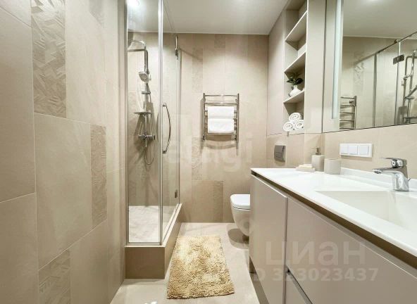 Полностью оборудованный санузел - ванна, унитаз, раковина, полотенцесушитель, зеркало с подсветкой, навесной шкаф.