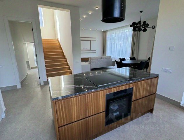 Полы первого этажа и ванных комнат выполнены из мрамора, как и ступени полувинтовой лестницы, ведущей на второй этаж. Двери, порталы и карнизы из массива лиственных пород выгодно выглядят в естественном освещении из панорамных деревянных окон. Дом просторный и светлый, он наполнен воздухом за счет высоких потолков и открытых пространств.