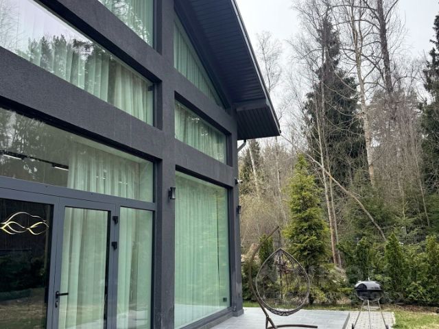 Рига Парк | Загородный дом у леса с премиальной отделкой Предлагается в аренду современный загородный дом площадью 300 м², расположенный на участке 7,3 соток с приватным выходом в лесной массив. Локация обеспечивает высокий уровень уединения и тишины, оставаясь при этом в удобной транспортной доступности. Архитектура дома выполнена в стиле фахверк в современной интерпретации: лаконичный фасад в тёмно-серой гамме, натуральные текстуры и продуманная архитектурная подсветка формируют выразительный и статусный облик. Панорамное остекление обеспечивает максимальную инсоляцию и визуально расширяет пространство. Интерьер реализован в светлой нейтральной палитре с использованием качественных материалов. Дом полностью меблирован и оснащён встроенной бытовой техникой ведущих брендов. Установлены системы кондиционирования, приточно-вытяжной вентиляции, подогрева полов и умный дом, что гарантирует высокий уровень комфорта в любое время года. Функциональная планировка включает просторную гостиную с дровяным камином, объединённую с кухней-столовой, что создаёт идеальное пространство для приёма гостей и семейного отдыха. Также предусмотрены три спальни, отдельный кабинет и гардеробные комнаты. Участок благоустроен: выполнено озеленение, высажены хвойные деревья и сформирована живая изгородь по периметру, обеспечивающая дополнительную приватность. На террасе организована зона отдыха с возможностью барбекю. Свободное пространство участка позволяет дополнительно оборудовать детскую или спортивную площадку. Парковка предусмотрена на территории участка, а также рядом с домом. Планировка дома: 1 этаж: прихожая, кухня-гостиная, обеденная зона с панорамными окнами, кабинет, уличная гардеробная, гостевой санузел, постирочная, котельная, терраса. 2 этаж: мастер-спальня с гардеробной, санузлом и ванной в пол у окна, две спальни, санузел с сауной и душевой, балкон.