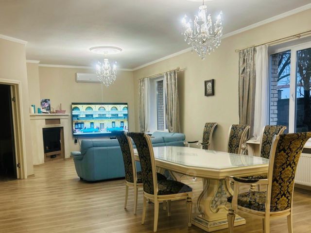 На первом этаже большой банкетный зал (75 кв м), четыре больших раскладных дивана, телевизор, караоке, мощная колонка с блютузом, сауна, комната отдыха с большим раскладным диваном, душевая, бассейн с подогревом, два санузла. На втором этаже, - холл, четыре изолированные отдельные спальни, с дополнительными спальными местами, санузел с джакузи, подогрев пола.
