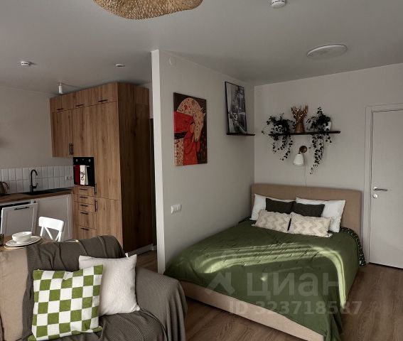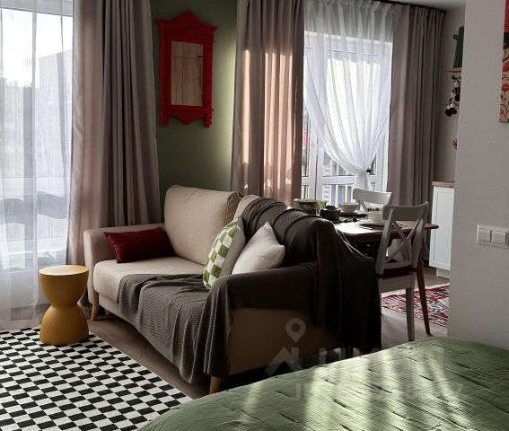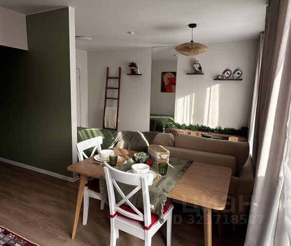 Гостиная. Большой диван (раскладывается), большой телевизор (55 дюймов) с интернетом и Google TV. Так же есть просторное рабочее место со столом. Высокое напольное зеркало. Свет регулируется теплый-холодный, ярче-темнее, разные цвета.