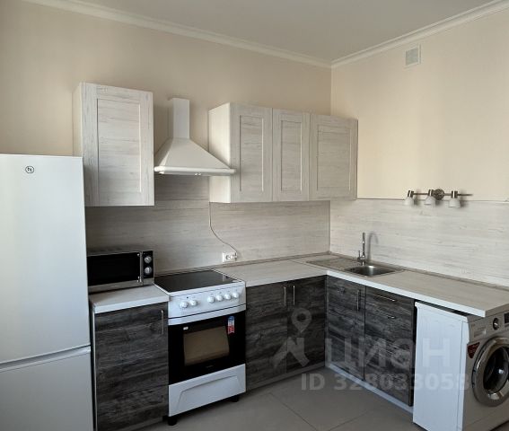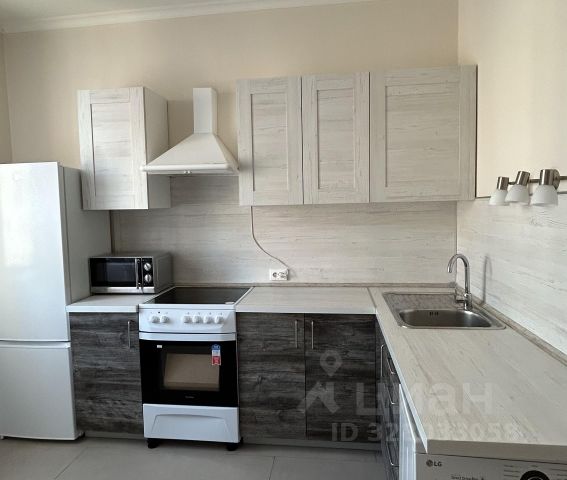 На кухне: кухонный гарнитур с необходимой техникой (варочная панель, духовой шкаф, вытяжка, встроенный холодильник, микроволновая печь, электрочайник, стиральная машина), раскладной диван, стол, стулья, телевизор.