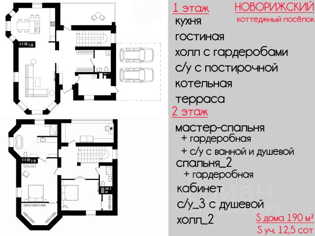 1 этаж - гостиная, кухня-столовая, гостевой с\у с постирочной зоной, входная группа с гардеробами и местами хранения, котельная, выходы на придомовые террасу и гараж;