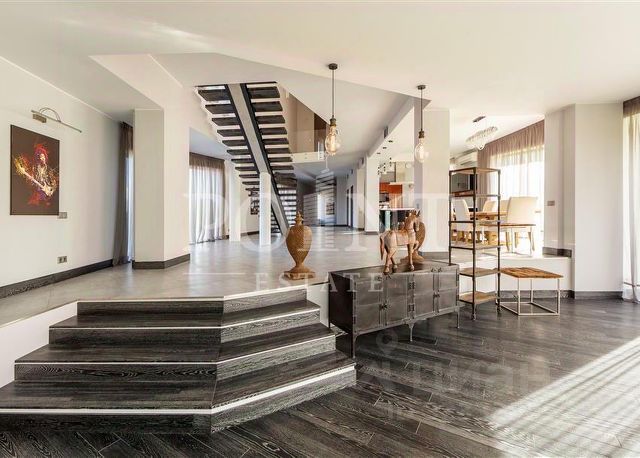 ID 42784. Предлагается новый стильный дом в охраняемом поселке Кристалл Истра. Дизайнерский ремонт, панорамное остекление, дорогие качественные материалы (камень, дерево, ковка). Планировка: 1 уровень: гараж на 3 м/м, прихожая, холл, гостевой с/у, постирочная, СПА зона: сауна, душевая, предбанник, комната отдыха с барной стойкой. 2 уровень: прихожая, холл, кухня столовая гостиная с биокамином, домашний кинотеатр, выход на участок, гостевая спальня с с/у. 3 этаж: холл, мастер-спальня с с/у и гардеробной, спальня с с/у, кабинет (спальня), спальня детская с с/у и гардеробной. Квартира для персонала с отдельным входом (спальня, кухня, с/у) На разноуровневом участке крытый бассейн, большая беседка, выполнен ландшафтный дизайн, озеленение (туи, сосны, ели, клёны), освещение, вымощены дорожки, установлена система автополива, КП "Кристалл Истра" это 160 двухуровневых и трехуровневых резиденций площадью от 489 до 1148 кв. м, выполненных в трех стилях: Soft-Tech, неоклассицизм, Frank Lloyd Wright. Коттеджный поселок завоевал первое место в номинации "Лучший загородный проект" в области девелопмента и архитектуры ARX AWARDS.На территории поселка выполнены ландшафтные работы, пешеходные дорожки выложены брусчаткой, предусмотрено уличное декоративное освещение. Внутренняя инфраструктура представлена спортивной и детской площадками, полноценным горнолыжным спуском с подъемником и прогулочной набережной с беседками. PLEASE FEEL FREE TO CONTACT INTERMARK REAL ESTATE TO GET DETAILED INFORMATION OR TO SET UP A VIEWING! 24/7 HELP DESK SERVICE WITH ENGLISH -SPEAKING OPERATORS